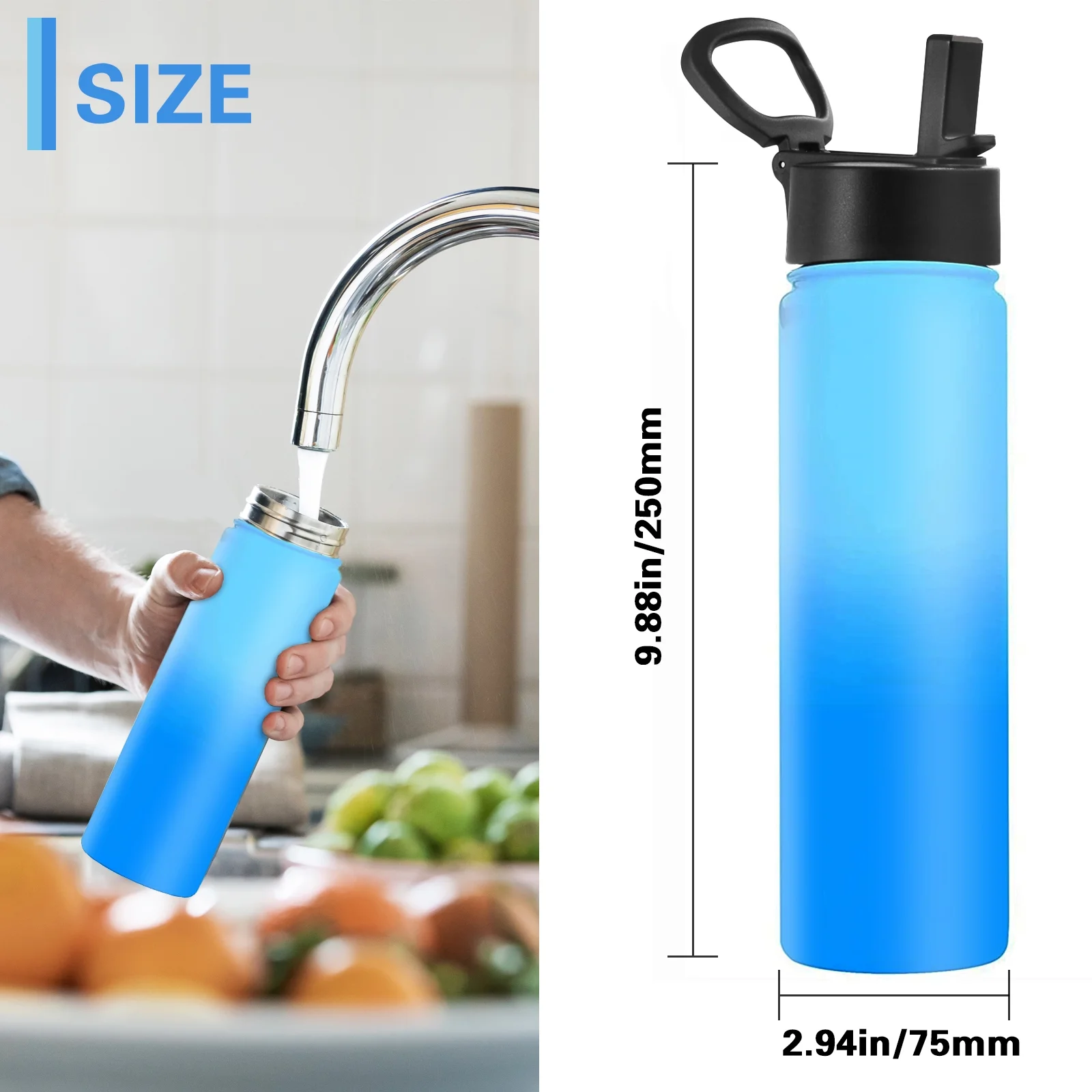 With its vibrant blue color and sleek design, this bottle is both functional and stylish. The smooth exterior gives it a modern look, while the powder-coated finish ensures a comfortable grip, making it ideal for everyday use. It’s designed to complement your active lifestyle with a fresh and trendy appearance.